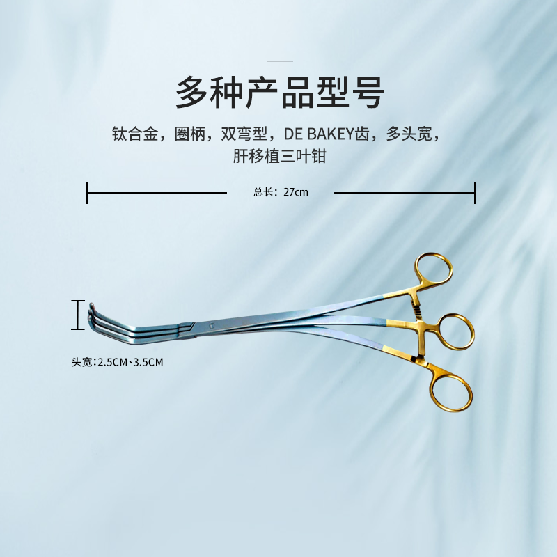 50.3322.27血管鉗 雙彎型,總長(zhǎng)27cm 頭寬35mm DE BAKEY齒 肝移植三葉鉗