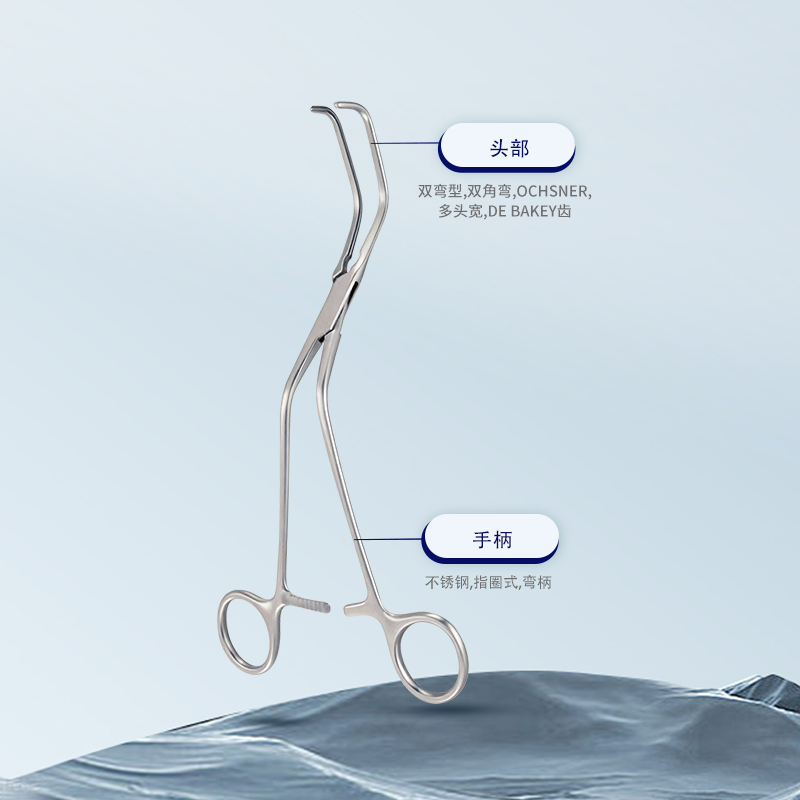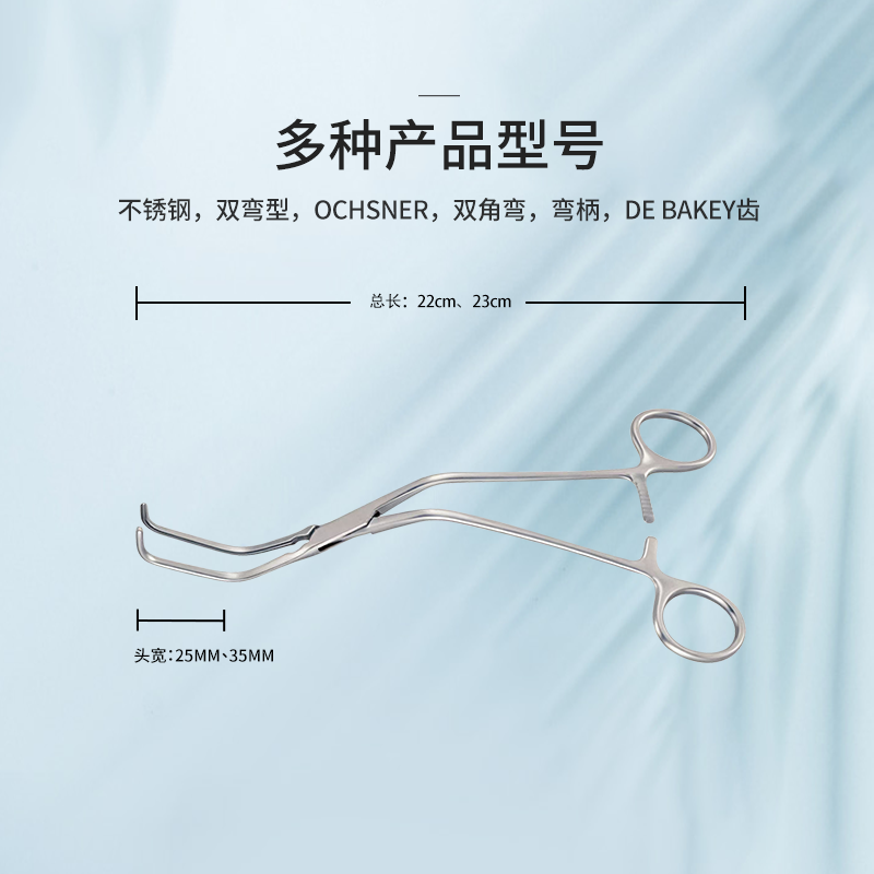| 14.0220.22 | 血管鉗 | 雙彎型,22.0cm OCHSNER 雙角彎 頭寬25mm 彎柄 DE BAKEY齒 |