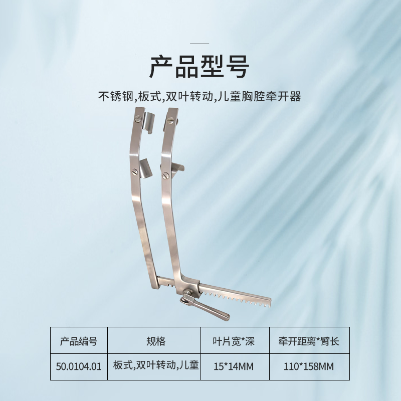 50.0104.01 胸腔牽開器板式,雙葉轉(zhuǎn)動(dòng) 葉片寬15mm 葉片深14mm 牽開距離110mm 臂長158mm 兒童