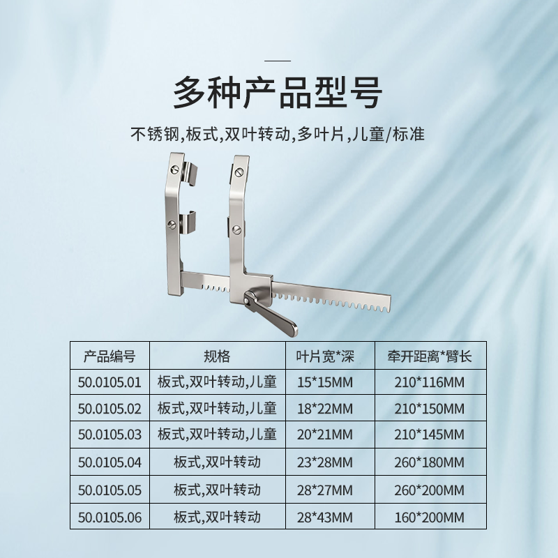 | 50.0105.05 | 胸腔牽開器 | 板式,雙葉轉(zhuǎn)動 葉片寬28mm 葉片深27mm 牽開距離260mm 臂長200mm |