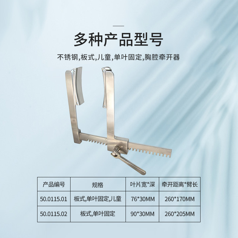 50.0115.01胸腔牽開器板式,單葉固定 葉片76mm*30mm 牽開距離260mm 臂長(zhǎng)170mm 兒童