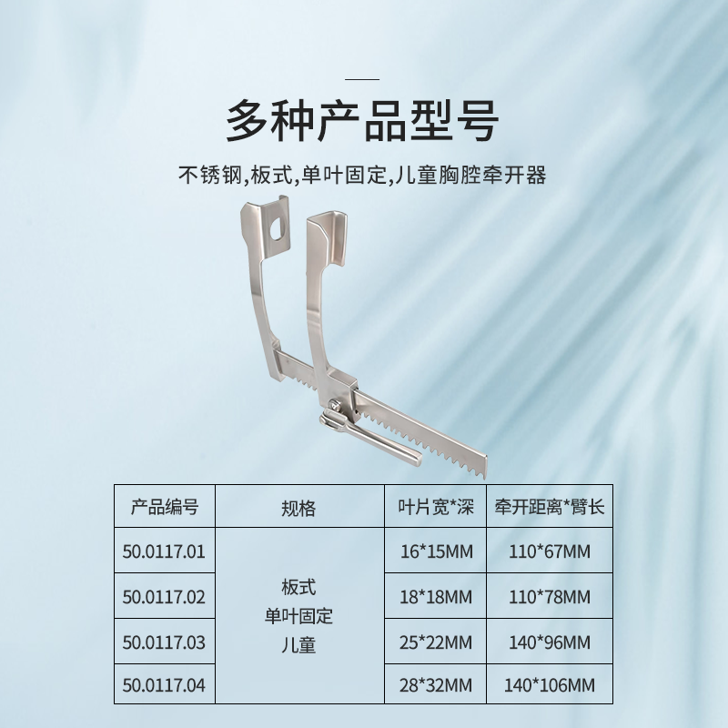 50.0117.04胸腔牽開器板式,單葉固定 葉片28mm*32mm 牽開距離140mm 臂長106mm 兒童