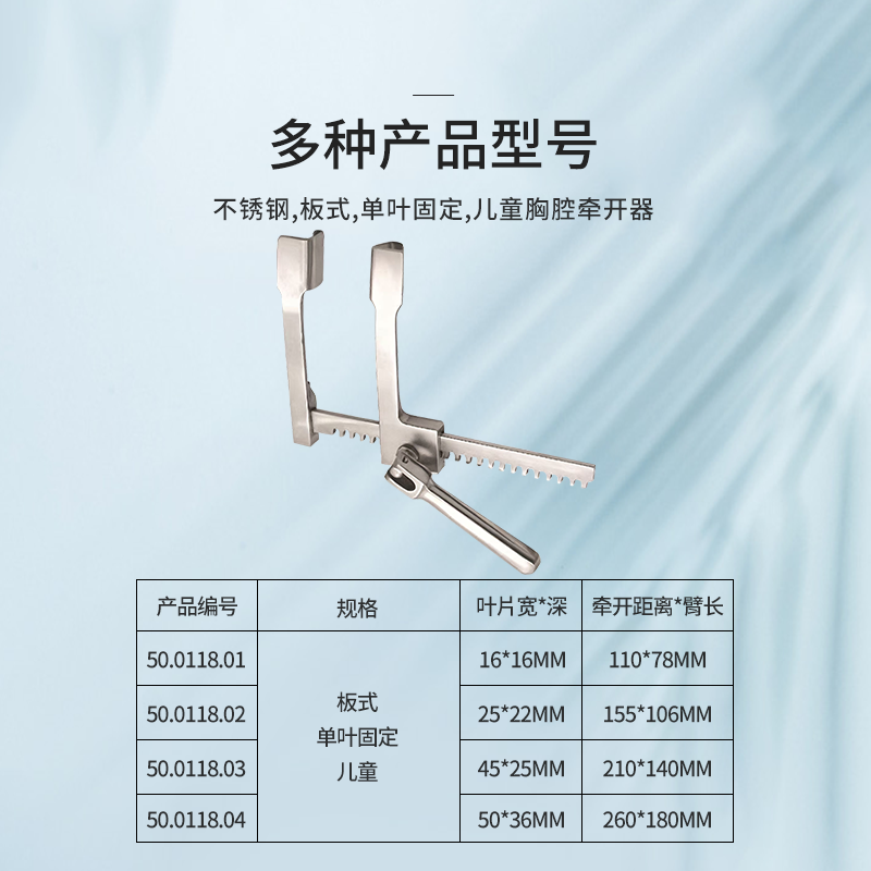 50.0118.04胸腔牽開器板式,單葉固定 葉片50mm*36mm 牽開距離260mm 臂長(zhǎng)180mm 兒童
