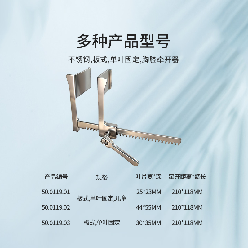 50.0119.01胸腔牽開器板式,單葉固定 葉片25mm*23mm 牽開距離210mm 臂長118mm 兒童